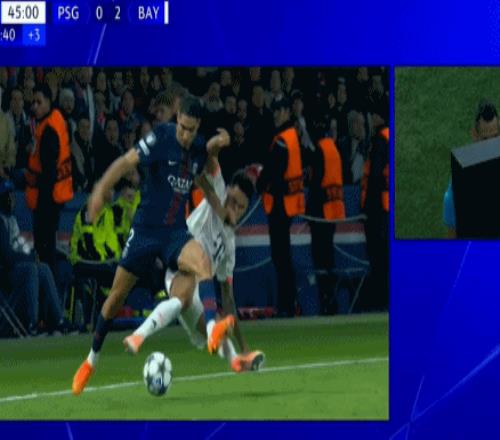 第45分钟,路易斯-迪亚斯回追放倒阿什拉夫,后者倒地痛哭,随后被队友搀扶离场。随后VAR显示路易斯-迪亚斯有剪刀腿的情况,裁判改判直红,7500万先生苦笑离场,拜仁剩下10人应战。