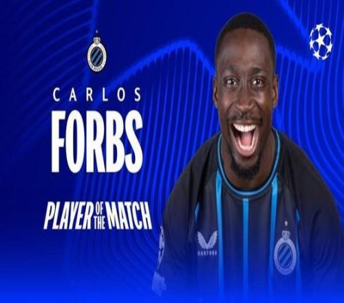 欧冠联赛阶段第四轮,布鲁日主场3-3战平巴塞罗那,此役贡献2球1助的布鲁日前锋卡洛斯-福布斯当选欧冠官方全场最佳球员。