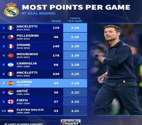 北京时间1月13日,皇家马德里官方宣布了球队主帅哈维-阿隆索的消息,事后德转列出了银河战舰队史主帅场均积分排名,哈维-阿隆索以2.24分位列第7。