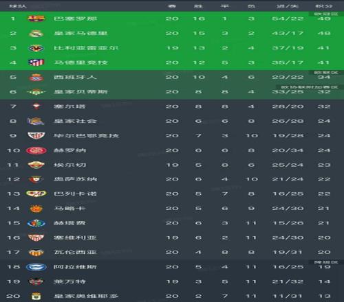 前四名的球队积分都已经突破了40分,已经领先了身后的球队至少7分,整体的优势明显。西班牙人0-2不敌赫罗纳,积分停留在34分暂列第5名。塞尔塔3-0完胜巴列卡诺迎来三连胜,以32分暂列第7名。排在最后三名的球队分别是19分的阿拉维斯、14分的莱万特、13分的皇家奥维耶多!