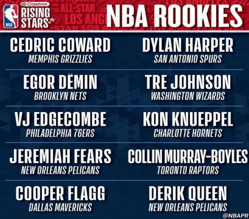 入选NBA全明星新秀赛的一年级球员, 总共有10人,分别是弗拉格(独行侠)、克尼佩尔(黄蜂)、埃奇库姆(76人)、科沃德(灰熊)、奎因(鹈鹕)、特雷-约翰逊(奇才)、哈珀(马刺)、博伊尔斯(猛龙)、杰明(篮网)和费尔斯(鹈鹕)。