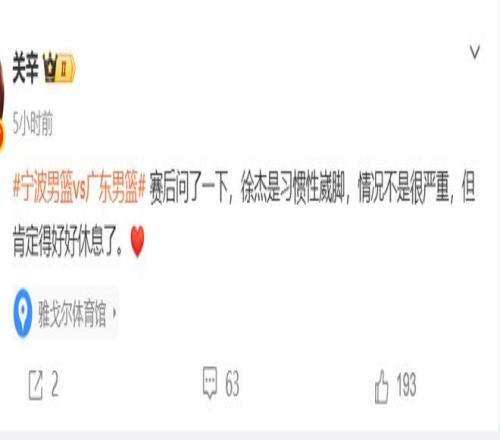 徐杰再一次伤到了脚踝,据赛后跟队记者关辛的报道,关师傅确认了徐杰的伤病情况——习惯性崴脚,情况不是很严重,但肯定得好好休息了。