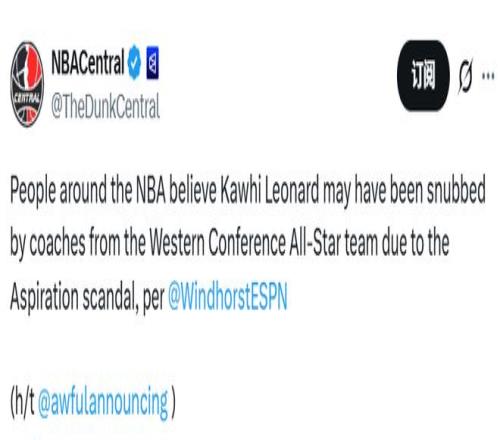 西部全明星的七个替补名额由教练们投票选出,但他们跳过了莱昂纳德。根据文霍斯特的爆料,或许是受到了他与快船赞助商存在“虚假代言”争议的影响。教练组与联盟方面大概率不希望,这项NBA年度盛会的焦点被一个仍在调查中的事件夺走。