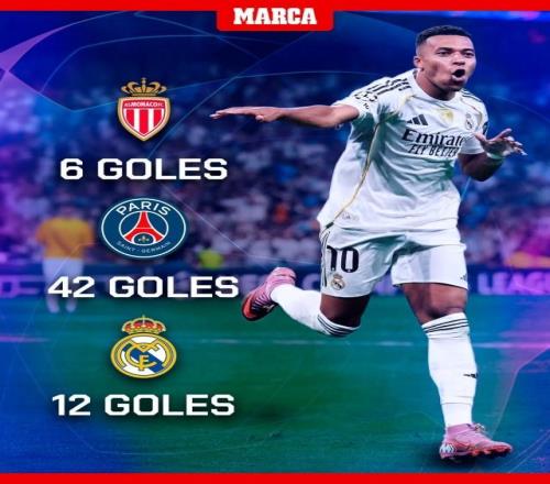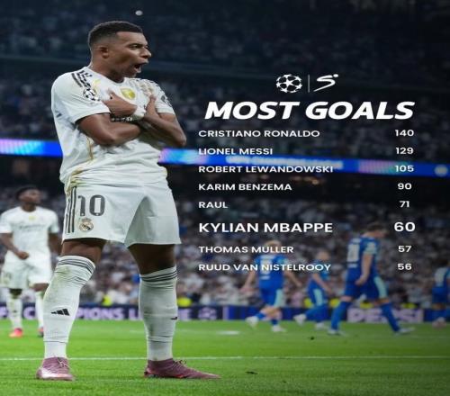 姆巴佩成为欧冠60球俱乐部第6人