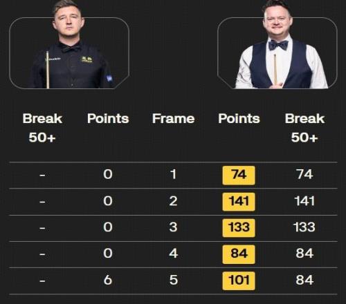 在整场比赛里,墨菲完全掌控了局势,打出了单杆74、141、133、84、84分。