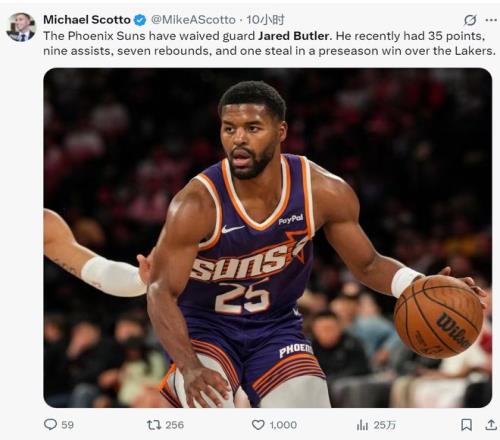 NBA的残酷现实在菲尼克斯太阳队的裁人决定中展现得淋漓尽致!球队官方宣布,正式裁掉在季前赛中爆砍35分7篮板9助攻的贾里德·巴特勒,同时将一份正式合同给到了他的直接竞争对手乔丹·古德温。