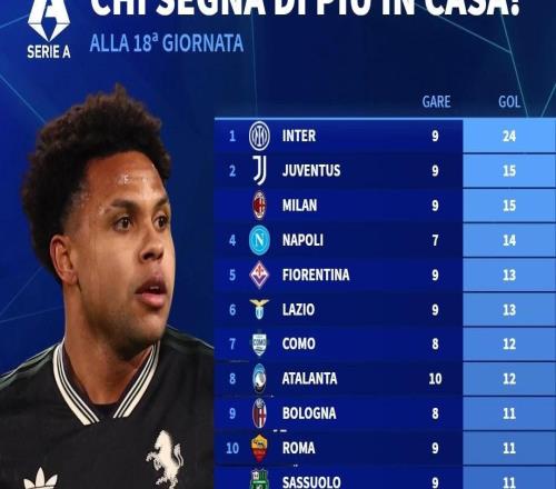 北京时间1月5日,在意甲前18轮结束后,德转列出了本赛季意甲球队主场进球数排行榜,国际米兰以9场打进24球断档领先,尤文图斯和AC米兰同以15球并列第二位。本赛季至今意甲球队主场