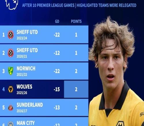 北京时间11月3日,来自德转的统计指出,狼队本赛季英超前10轮过后仅积2分,净胜球-15的成绩为英超历史联赛同期第三差的成绩。在这份榜单中,除狼队以外,排名前八的球队当赛季都最终